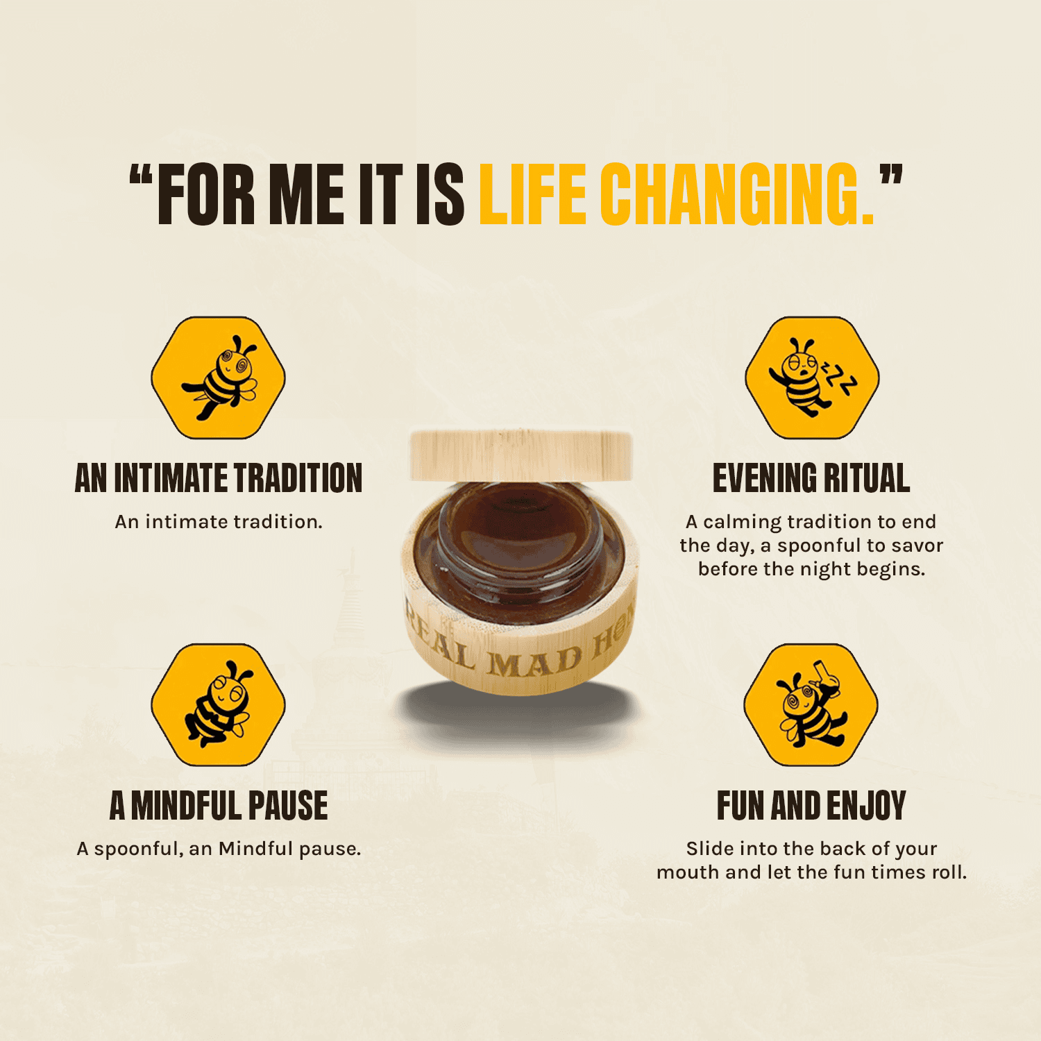 Mad Honey تجسس، ہنسی اور منفرد تجربات کے بارے میں ہے۔ یہ بات چیت کو جنم دیتا ہے اور عام لمحات کو یادگار چیز میں بدل دیتا ہے۔ دوستوں کے ساتھ اجتماعات سے لے کر مہم جوئی کے ذائقے تک، یہ ہمیشہ خوشی کے بارے میں ہوتا ہے۔ ایک نایاب شہد جو زندگی میں ایک چنچل موڑ ڈالتا ہے۔